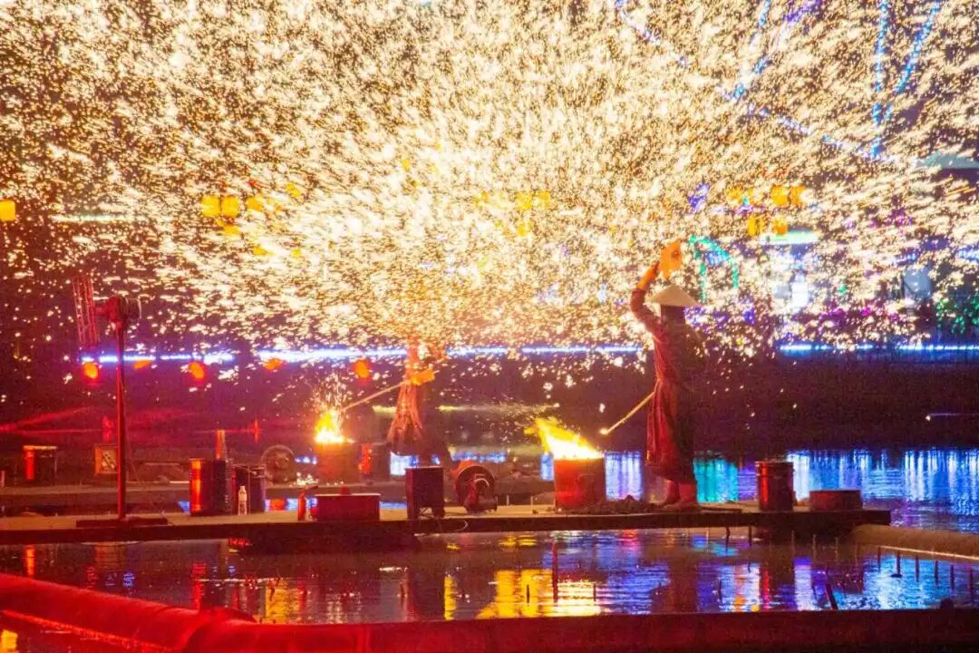 作为春节活动重头戏,大型实景演艺《戏说神农·华夏之火》于傍晚6点半震撼启幕,广受游客好评。“神农飞天秀唯美动人,凤凰凌空而过时,整片夜空都被点亮了。”专程带家人前来的张先生难掩兴奋,“打铁花、璀璨烟花、水下爆破等场景精彩纷呈,每一幕都让人目不暇接。”