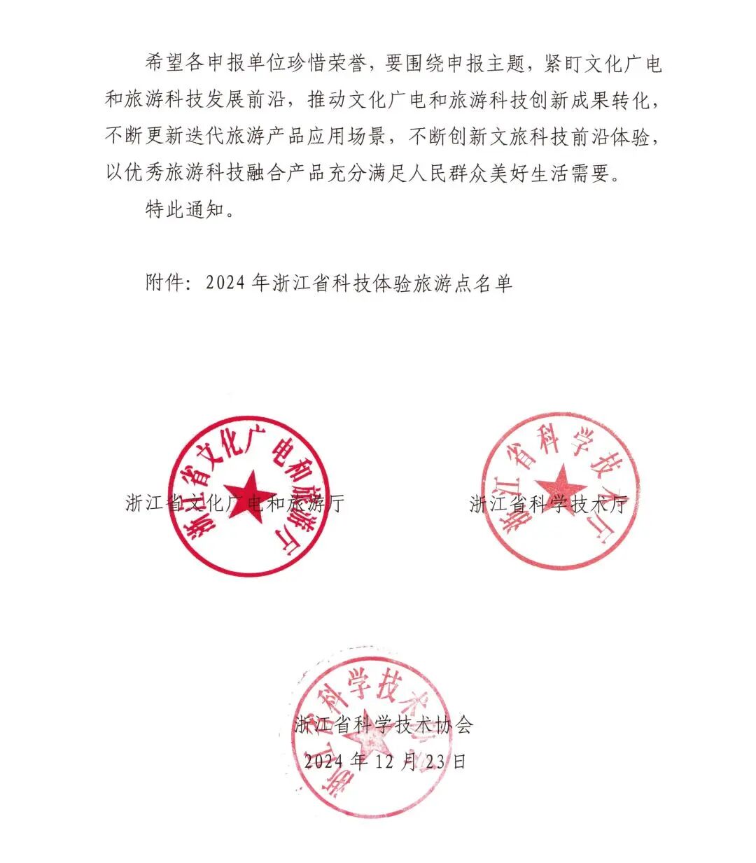近日,浙江省文化广电和旅游厅,浙江省科学技术厅,浙江省科学技术协会公布2024年省科技体验旅游点名单,达人村气象科普教育基地被评为“浙江省科技体验旅游点”